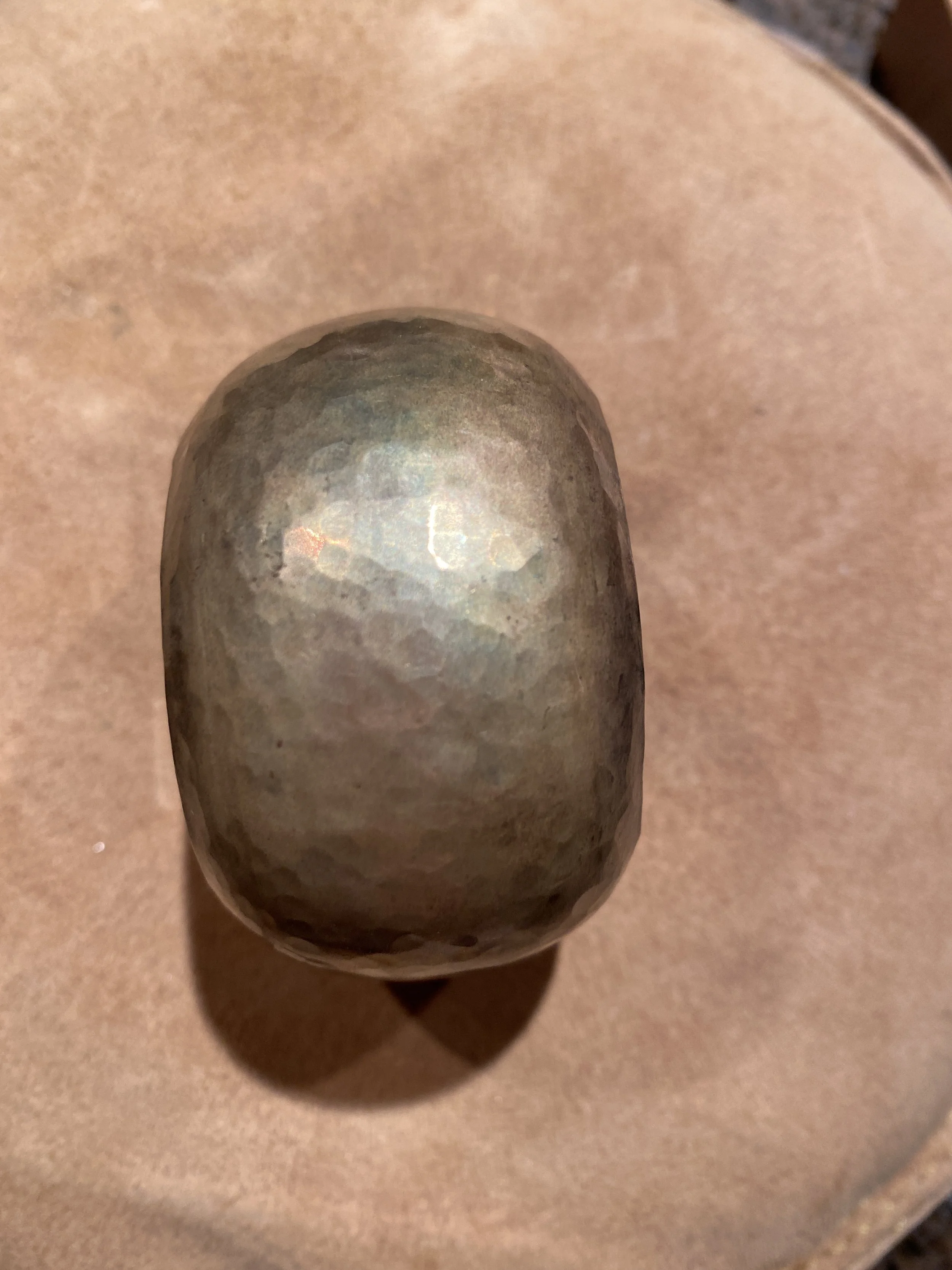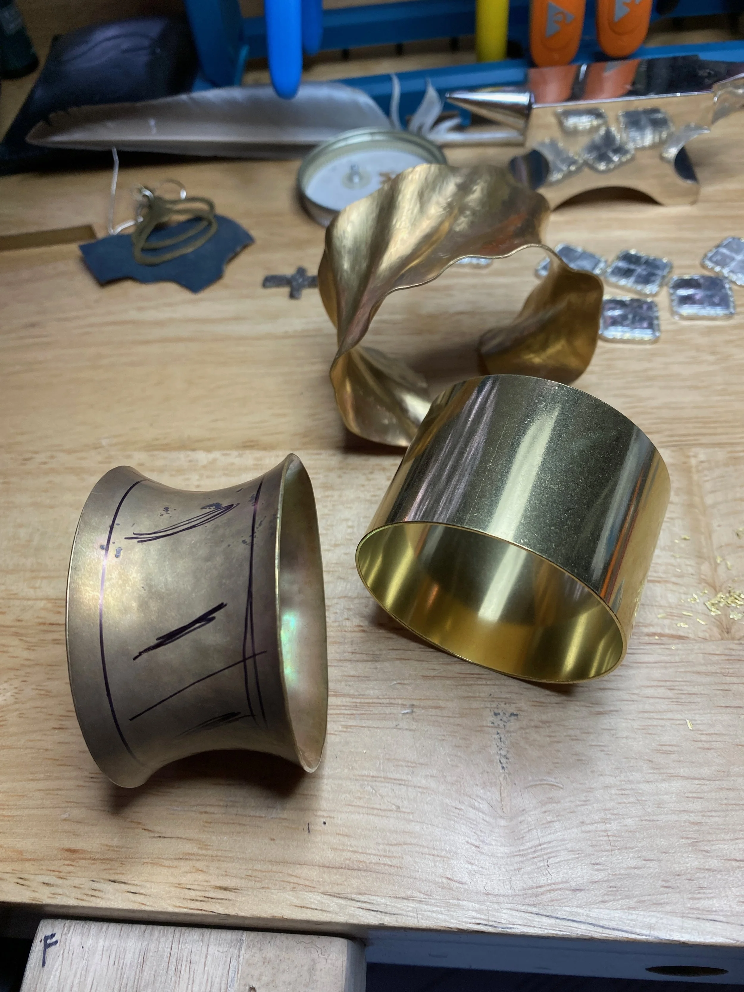 I begin with a brass blank & work the piece through a process of annealing and hammering to create the basic shape desired. Forms include concave, convex, flutes, ruffles, and much more.